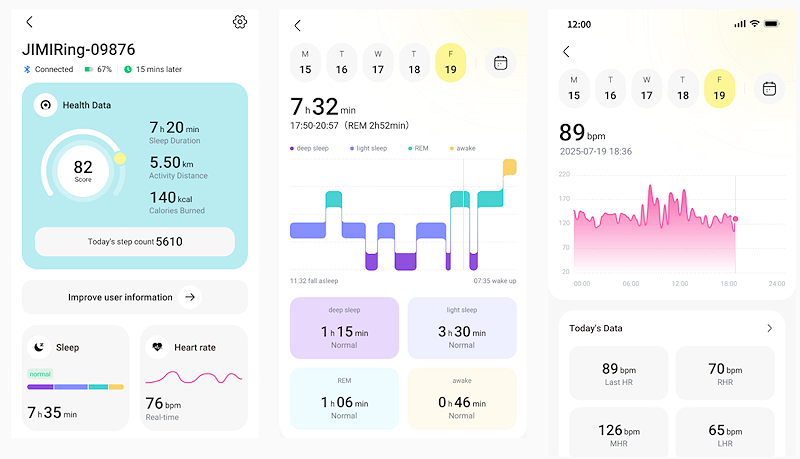 El dispositivo registra de manera ininterrumpida la frecuencia cardiaca, el nivel de oxígeno en sangre (SpO2), los patrones de sueño y los niveles de estrés, además de contabilizar los pasos diarios, la distancia recorrida y las calorías quemadas. Toda esta información se procesa en una aplicación móvil intuitiva, que genera informes detallados y transforma los datos en insights claros y prácticos. Entre sus funciones más destacadas se encuentra el Daily Health Score, un puntaje diario de salud que combina la actividad física, el descanso y las métricas biométricas en un único valor fácil de interpretar.