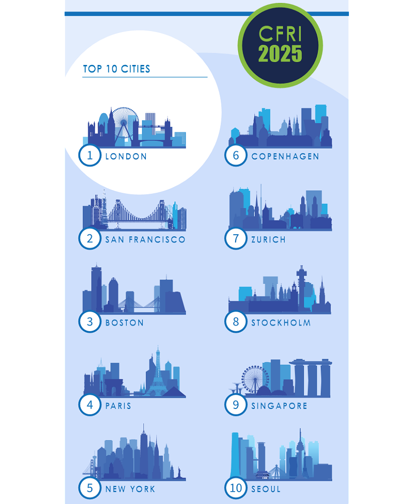 Según el CFRI 2025, Londres se posiciona como la ciudad más preparada para el futuro, destacando por su dinamismo financiero, vitalidad cultural y proyección global. Le siguen San Francisco, reconocida como pionera digital, y Boston, conocida por su liderazgo en investigación. El top 10 se completa con: París (4º), Nueva York (5º), Copenhague (6º), Zúrich (7º), Estocolmo (8º), Singapur (9º) y Seúl (10º).